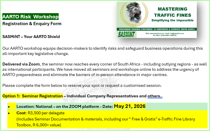 AARTO Risk Seminar – Hosted on ZOOM – 21 May Why choose this workshop? Delivered live via Zoom, it brings high-quality AARTO preparedness training directly to you — no travel, no accommodation, no traffic, no lost days in the office. Accessible from anywhere in South Africa and internationally – same depth – enhanced content.